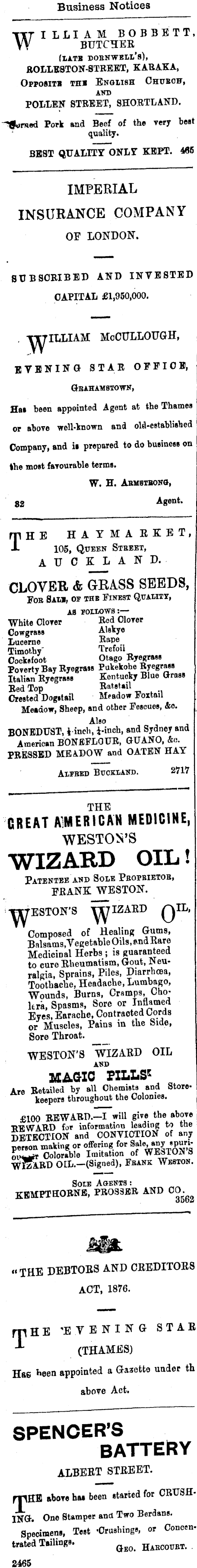 Business Notices WI LLI A M BOBBETT, BUTCHEE (LATE DOBNWBIL'b), BOLLEBTON-BTREET, KARAKA, Oppositb thi Engiish Chuboh, AND POLLEN STBEET, SHORTLAND. Pork and Beef of the very best ' quality. BEST QUALITY ONLY KEPT. 465 IMPERIAL INSURANCE COMPANY OF LONDON. SUBSCRIBED AND INVESTED CAPITAL £1,950,000. . TT7IIXIAM McCULLOUGH, EVENING: STAR OFFICE, GbAHAMBTOWH, flat been appointed Agent at the Thames or above well-known and old-established Company, and ii prepared to do business on the most favourable terms. W. H. ABMSTBOHG, 82 A BentTHE HAY M A EKE T, 105, Qtteen Stbeet, AUCKLAND. CLOVER & GBASS SEEDS, Fob Sam, of the Finest Quality, as rouows: — White Clover Rod Clover Cowgrass Alskye Lucerne »aPe., Timothy' Trefoil Cocksfoot Otago Ryegrass Poverty Bay Ryegrass Pukekohe Byegrau Italian Ryegrass Kentucky Blue Gross Red Top Ratst.il Crested Dogstail Meadow Foxtail Meadow, Sheep, and other Fescues, &o. Also BONEDUST, i-inoh, i-inch, and Sydney and American BONEFLOUR, GUANO, Ao. PRESSED MEADOW and OATEN HAY Airbed Bttokiahd. 2717 THE GREAT AIMERICAN MEDICIME, WESTOS'S WIZARD OIL! Patentee xvj> Sole Pbopbietob, FEANE WESTON. 'WBSTON'S YTJriZAED QIL, Gomposed of Healing Gums, Balsams, Vegetable Oils, and Eare Medicinal Herbs ; is guaranteed to cure Eheumatism, Gout, JN enralgia, Sprains, Piles, Diarrhoaa, Toothache, Headache, Lumbago, Wounds, Burns, Cramps, Cholera, Spasms, Sore or Inflame<l Eyes, Earache, Contracted Cords or Muscles, Pains in the bide, Sore Throat. WESTON'S WIZAED OIL AVD MAGIC PILLS* Are Retailed by all Chemists and Storekeepers throughout the Colonies. £100 REWARD.—I will give the above ■RTCWARD for information leadiog to the DETECTION and CONVIOTION of any person making or offering for Sal*.»ny .punm>Wr Colorable Imitation of WE3TOa S WIZARD OIL.-(Signed), Fbank Webton. SOIB A&ENT3 : KRMPTHORNE, PROB3ER AND 00^ "THE DEBTOES AND CEEDITOES ACT, 1876. mHE 'EVE NING STAE "*" (THAMES) Has heen appointed a Gaxetto under th above Act. SPENCER'S BATTERY ALBEET STEEBT. mHE »t>ovo h" been Btftrted for CRTJSH' ING. One Stamper and Two Berdans. Specimens, Test -Crushing, or Concentrated Tailings. &^ HaeCOTTET . 2465