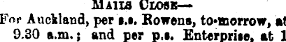 Maim Ck*k— For Auckland, per s.s. Rowena, to-morrow, at 9.30 a.m.; and per p.s. Enterprise, at 1