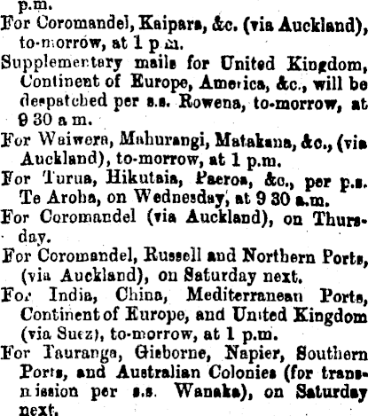 p.m. For Coromandel, Kaipara, &c. (via Auckland), to-morrow, at 1 p »a. Supplementary mails for United Kingdom, Continent of Europe, America, &c, will be (lecpstcbed per s.a. Rowena, to-morrow, at 9 30 am. For Waiwera, Mnhurangi, Mataktna, Ac, (via Auckland), to-morrow, at 1 p.m. For Turua, Hikutaia, Paeroa, &0., per c.s. Te Aroba, on Wednesday; at 9 30 a,m. For Coromandel (fia Auckland), on Thurs* • day. For Coromandel, Russell and Northern Ports, (via Auckland), on Saturday next. Foi* India, China, Mediterranean Ports, Continent of Europe, and United Kingdom (via Suez), to-morrow, at 1 p.m. For Tfturanga, GHsborae, Napier, Southern Ports, and Australian Colonies (for trans* niasion per s.s. Wanaka), on Saturday next. .