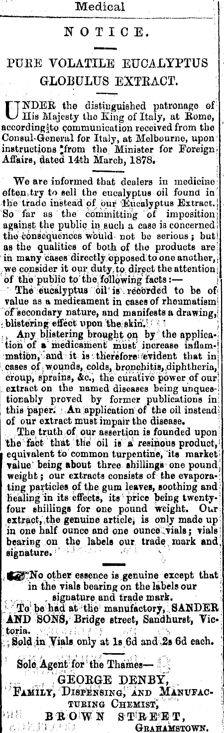 Medical NOTICE. PUEE VOLATILE EUCALYPTUS GLOBULUS EXTEACT. r.TNEpEB. the distinguished patronage of U His Majesty tho King of Italy, at Borne, accordinglto communication received from tho Consul-General for Italy, at Melbourne, upon instructions "from the Minister for Foreign* Affairs, dated 14th March, 1878. We are informed that dealers in medicine i often,try to sell the eucalyptus oil found in the trade instead' of bur Extract, i So far as the committing of imposition against the public in such a cuso is concerned > tho consequences would not be serious; but! as the qualities of both of the products are ' in many cases directly opposed to one another, we consider it our, duty, tp. direct the attention of the public to' the'following facts: —■ ' The eucalyptus ;6il?is\ recorded to be of value as a medicament in cases of rheumatism of secondary nature, and manifests a drawing, [blistering 'effect upon the] skin.; J'l 1 Any, blistering brought on by: the application of a medicament' must 1 increase iaflam-' matibn^arid; it is. thereforei fetident that in cases of ; wounds, colds, bronchitis,.diphtheria,' croup, sprains, &6.', the curative power of our' . extract on the named diseases being unquestionably proved by former publications in this paper. An application of the oil instead of our extract mußt impair the disease. , The truth of our assertion is founded upon the fact that' tile oil is a, resinous product, equivalent to common turpentine, its market value being about three shillings one pound \ weight; our extracts consists of the evaporating particles of the gum leaves, soothing and healing'in its effects, its'price being twentyfour shillings for one pound weight. Our extract, the genuine article^ is only made up in one half ounce and one ounce vials; vials bearing on the labels our trademark and, signature. l! ■'■■'* . Jg^°No other essence is,genuine except that, in the vials bearing on the labels our < ..,..,.... r signature and trade mark. ; I■"'To s bebid a't-ttip' manufactory,: SAM DEE AND SONS, Bridge street, Sandhurst, Vic-j toria. .■-■■;.:; ■..:■]{[■'') ■■.'.;■ ?.'"'":. ': ;; Sold in Vials only at Is 6d and 2s 6d each. \ Solo, Agent:for! the Thames— h^ ■ ,_ : ( :GE<jbse denby,..., I Fxitoit, Dispensing} and Manufac- | tubing Chemist^ ! ■iff; _ BiO'WN S'T>RE«ET, ; C^f.J'.'V. 5-^ ' _ GeAHAMSTOWN. i