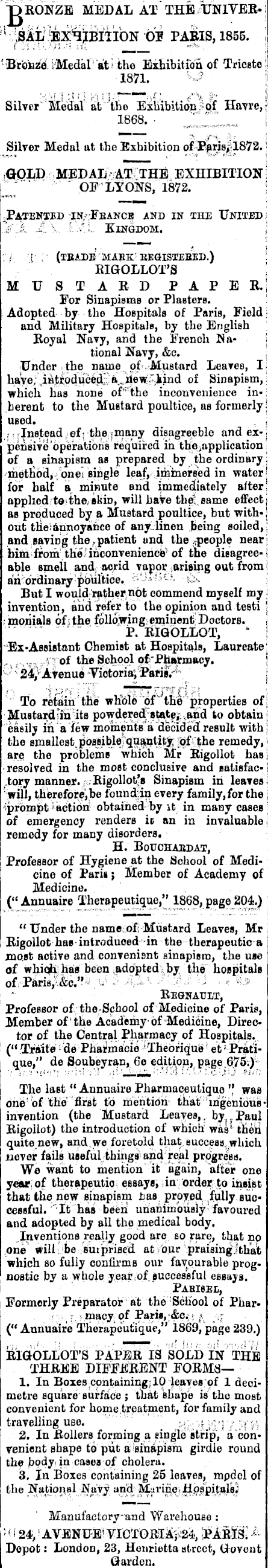 TDRONZE MEDAL AT THEJUNIVER-j 1 ,SAL EX^JBITION OB PABIS, 1855. \ 'Bronze. .'Medal at the Exhibition of Trieste' 1871. ' I Silver Medal at the Exhibition of Havre,! 1868. / i Silver Medal at the Exhibition of Ppris, 1872. ■ GjOLD MEDAL AT THE EXHIBITION! _""" OF LYONS, 1872. \ in/-Fbancb and in the United ; j;J,. J.. \. Kingdom. ; ,/ [ ; (tbadb'maek'bechstebed.) I RIGOLLOT'S ! MUSTARD PAPER.; For Sinapisms or Plasters. '. Adopted by the Hospitals of Paris, Field and Military Hospitals, by the English Royal Navy, and the French Ha- j tional Navy, &c. \ Under the name ; of .Mustard Leaves, 1\ have;^Btipdi^ectiDa^ile^sliind of Sinapism,; which has none of' Kthe inconvenience in-; Jberenfc to the Mustard poultice, as formerly j used. . \ ;i < .Instead, ©f < the.ymany disagreeble and ex-1 pensive'operations required in the,application of a sinapism as prepared by the ordinary; method, > qnel single leaf, immersed in water for half a minute and immediately after, applied tothe ekiD, will have the! same effect j as produced by a Mustard poultice, but without tHe:Annoyance of any linen (being soiled,' and saving the,patient and, the .people near him from the inconvenience of the disagree-1 able smell and acrid vapor arising out froml an ordinary poultice. ■ -'-»'- f-?- ?a% i But I would rather not commend myself my ■ invention, and refer to the opinion and teeti ' ; inornate of the following eminent Doctors. , P. RIGOLLQT, * ! "Ex-Assistant Chemist at Hospitals, Laureate: s ,-,-•,.■;■'"!" of the School of Pharmacy. | ;-^2^ iAv:enuo'iv riotoriai i!PafißV l" ' j To retain the whme of" the properties of! Mustard in its powdered state, .and to obtain easily in a few moments a decided result with; the smallest possible quantity, of the remedy, < are the problems which Mr Rigollot has; resolved in the most conclusive and salisfac-i tory manner. Rigollot's Sinapism in leaves Vill, therefpr£be foundjin every family,for the | '■prompt*action: obtained-by it in many cases; of emergency renders ie an in invaluable; remedy for many disorders. H. BoFCHABDAT, Professor of Hygiene at the School of Medicine of Parit j Member of Academy of Medicine. ("Annuaire Therapeutique,'' 1868, page 204.) " Under the name of; Mustard Leaves, Mr Rigollot has introduced -in the therapeutic a most active and convenient sinapism, the use of whiqfc has been adopted by the hospitals of Paris^c." V■' -;; U!> '<*'■$■'■ ':1 ■« Begnaum, Professor of the School of Medicine of Paris, Member of the Academy of Medicine, Director of the Central Pharmacy of Hospitals. ("Traite -de i Phaimacie >ihebrique l ct f Pratique," de Spubeyran, 6e edition, page.67s;)* The last " Annuaire Pharmaceutique " was ohe'of the'flrat to mention that ingenious' invention (the Mustard Leaves,, by u Paul Rigollot) the introduction of which'-was L tiihii quitenew, and,we foretold that success,which never fails useful things and real progress. We want to mention it again, after one year of therapeutic essays, ia; order to insist that the new sinapism lias proved fully successful. "It has been' unanimously-favoured and adopted by all the medical body. Inventions really good are bo rare, that no one will- be surprifleid at/our ■ praising jthat which so fully confirms our favourable prognostic by a whole year,of. successful essays. Pabisel, Formerly Preparator ■' at the !Sch'ool of Phar- . .<-,; j : macy of Paris,;&<?.; 5/, -;■ (" Annuaire Tnerape'utiiciue," 1869, page 239.) RiaOLLOT'S PAPER IS SOLD IN THE THREE DIFFERENT FORMS— 1. In Boxes containing 10 leaves of 1 decimetre square surface ; that shape is the moist; convenient for home treatment, for family and travelling use. 2. In Rollers forming a single strip,' a convenient shape to put a Binapism girdle round the body in cases of cholera. 3. In Boxes containing 25 leaves, mpdcl of the National Navy and Marine.Hospitals." Manufactory and Warehouse: '«i 24/ AVENUE' VICTORIA, '2% PARIS. - Depot: London, 23, Henrietta street, Uoveut Garden.