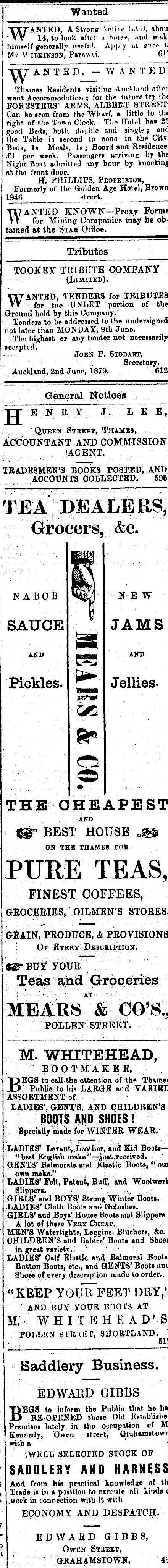 Wanted WANTED, A Strong \c.iive LAD, nboul 14, to look after v Iktml, r>nd makt himself generally usefn'. A\>\>\y at onoo U JVv Wilkinson, Pnravrai. 6L7 T^T ANTED. - W ANTED. Thames Residents visiting AurUand oft™ want Accommodation j for the futuro try tho FORESTERS' ARMS, ALBERT STREET. Can be seen from tho Wharf, » little to the right of fcho Town Clock. The Hotel has 23 good Beds, both doublo and single j and the Table is second to none in tho City. Beds, Is Mouls, le j Board and Residence, .€1 per week. Passengers ftrriving by the Night Boat »dmitted any hour by knocking aft the front door. #. PHILLIPS, Pbopeiktob, Formerly of tho Golden Ago Hotel, Brown 1946 street,. WANTED KNOWN—Proxy Forms for Mining Companies may be obtained at the Star Office. Tributes TOOKEY TRIBUTE COMPANY (Limited). WANTED, TENDERS for TRIBUTES for ttio TJNLET portion of the Ground held by this Company.! Tenders to bo addressed to the undersigned not later than MONDAY, 9th June. ' Tho highest er any tender not necessarily accepted; --•■-■ John P. Siodaht, Secretary. , Auckland, 2nd Juno, 1879. 612 General Notices TT E NR V J. L E E, ...... Queen Street, Thames, ACCOUNTANT AND COMMISSION ; _ , , , JAGENT. , _ ■■'. .;. TRADESMEN'S BOOKS POSTED. AND ACCOUNTS COLLECTED. 595 NABOB « ; NEW SAUCE JAMS and mmm AND Pickles. Jellies. .-■■■• frSS^ :■:■■ ; ■■■ --.o: . *HB CHEAPEST AND BEST HOUSE „£) ON THE THAMES FOB PURE TEAS, FINEST COFFEES, GROCERIES, OILMEN'S STORES. GRAIN, PRODUCE, & PROVISIONS Of Etery Description. tS- BUY YOUR Teas and Groceries AT MEARS & COS., POLLEN STREET. M. WHITEHEAD, BOOTMAKER, BEOS to call the attention of the Thames Public to his LARGE and VARIED ASSORTMENT of LADIES', GENT'S, AND CHILDREN'S BOOTS AND SHOES! Specially made for WINTER WEAR. LADIES' Levant, Lnather, and Kid Boots— ' " best English make " —just Teceived. GENTS' Balmorals and Elastic Boots, " our ' own make." LADIEB' Felt, Patent, Buff, and Woolwork Slippers. GIRLS' and BOYS' Strong Winter Boots. LADIES' Cloth Boots and Goloshes. GIRLS' and Boys' House Boots and Slippers : A lot of these Vbbx Cheap. MEN'S Watertight*, Leggins, Bluchers, &o. CHILDREN'S and Babiea' Boots and Sboes in great rariety. LADIES' Calf Elastic and Balmoral Boots, Button Boots, etc., and GENTS' Boots and Sboes of every description made to order. "KEEP YOUrTfEET DRY/ AND BUY YOUR BOOTS AT M. WHITE HE AD' S, POLLEN SIR K IST, SIIOKTLAND. , ; ■ ■■■'■■ ■■ • 5H tSaddlery Business. EDWARD GIBBS BEGS to inform the Public that he hai RE-OPENED those Old Ertnblisbec Premises lately in tho occupation of Mi Kennedy, Owen street; Grubamstowri with a ' .WELL SELECTED STOCK OF ; SADDLERY AND HARNESS i And from his practical knowledge of tin , Trade is in a position to execute all kinds o b .work in connection with it with ECONOMY AND DESPATCH. EDWARD GIBBS, P .-,. Owen Sxuekt, ' GRAHAMSTOWN, 46