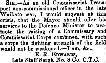 Sib, —As an old Commissariat Transport non-commissioned officer in the lato Waikato war, I wpuld suggest at this crisis, that the Mayor should offer his services to the Defence Minister to promote the raising of a Commissary and Commissariat Corps combined, with such a corps the fighting strength of the field wdiild not be weakened.—l am, &c, E!B. Edwards, Late Staff-Sergt. No. 8 Co. C.T.C.