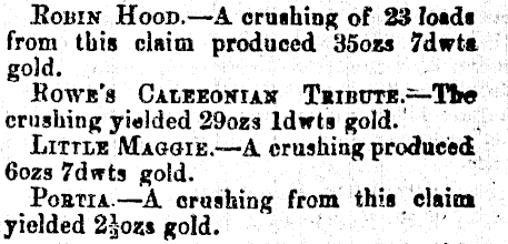 Robin Hoop. —A crushing of 23 loads from this claim produced 35oss 7dwt* gold. BOWB'S CAtSEOKIAK T*IBDTE.=-Tfce crushing yielded 29ozs ldwts gold. Little Magoie.—A crushing produced 6ozs 7dwts gold. Postii.—A crushing from this claim yielded 2|ozs gold.
