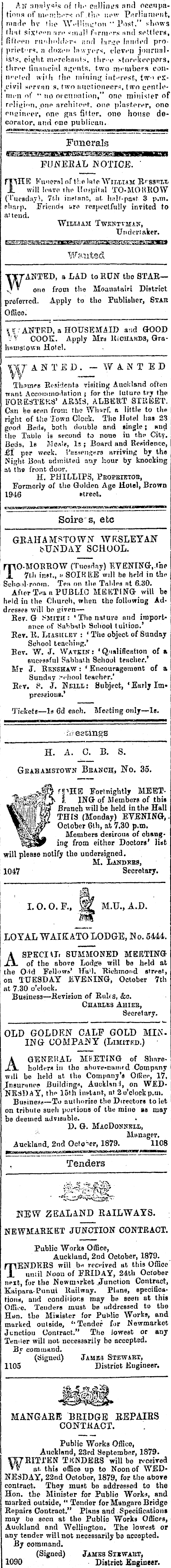 An :inniy«'s of tli.- caDinas nnd occupations of members of,the new Pdriiunient, mode hh r Jho WVlUhcUhi " Post," shows flint six'e<'n ;»»■<• >;nail farmers i»nd settlers, fifteen rnt>h»l(?.'-ri ;\tu\ forge lauded propriet'Ts. m dozen iHwj'efs, eleven journalists. eight merchants, tiir^w storekeepers, three (iuiuiciut agents, two members connected with (lit* rniniiiij int'TPst, tw" *«s- - tven inieticneerv!, livo ijentlemen of " no oicnnation," one minister of religion, one nrehitoet-, one plasterer, one engineer, one gas fitter, one house decorator, and one publican. Funerals j FUNERAL JNOTICE. " fIIHE Funeral of the late Wimtam Rr'SSRIjT. JL will le.ire. xho Hospital TO-MOKROW ('t'upsday), 7t!i in?tnn&, a(. hn!f-pasf 3 p.m. pliarp. Friend* arc respectfully invited to a! tend. WIIiTiIAJI TwKNTTJIAIf, Under! aker. Wanted WANTED, a, LAD to EON the STAR— ono from the Moanatairi District preferred. Apply to tho Publisher, Stab Ofiloo. \? "ANTED, a HOUSEMAID ar.d GOOD V'V COOK. Apply Mrs KiCHAKDS, Grahnnistovrn Hotel. WANTED. — WANTED Thnmfß Rosidenta visiting Auckland often want Accommodation ; for the Cuture try the FORESTERS' ARMS, ALBERT STREET. Can fee senn from the Wharf, c little to the right of the Town Clock. The Hotel has 23 good Bed*, both double and eingle; nnd i,ht» Tublo is second to nouo in thy City. Bods, 1b Mofl!«, Is ; Board and Residence, iff per w«ek. PusHen-jers arriving by the Night Bout odmiLted any hour by knocking at> the front door. H. PHILLIPS, Peopeiktob, Formerly of the Golden Age Hotel, Brown 19i6 etreot. Soire s, etc GEAHAMSTOWN" WRSLEYAN bTJNDAT SCHOOL. TO-MORROW (Tuosflay) EVKNINGr,.Ine 7(.h in*t., i> SOIREE'will be held in tho School-room. Ten on f.he TjiJ.lps nt 6.30. After Tttan PUBLIC HffiKTING- will be held in the Church, when the following Addresses will bo given— Her. G Smith: 'The nature nnd importnnce of Sabbatb School tuition.' Rev. R. LiASitLEr : ' The object of Sunday School teaching.' Eev. W. J. Watkik: 'Qualification of a eueespfiil Sabbath School teacher.' Mr J. Rknshaw : * Encouragement of a Sunday ."ciiool teacher.' Her. $. J. Heims Subject, 'Early Impressions.* Tickets—la 6d ench. Meeting only—la. iv> eatings H. A. C. B. S. Gbaeamstown Bbanch, No. 35. frSpHK Fortnightly MEETI. ING of iMembers of this Branch will be held in the Hall THIS (Monday) EVENING,. October 6th, at 7.30 p.m. Members desirous of changing from either Doctors' lint will please notify the undersigned. M. LAHDJHH9, 1047 Secretary. 1.0.0. F., W M.U.,A.D. LOYAL WAIKATO LODGE, No. 5444. A SPECIAL SUMMONED MEETING of the above Lodjre will bo held at the Old Fellows' HWI, "Richmond stri-et^ on TUESDAY EVENING, October 7th at 7.30 o'clock. Business —Revision of RulfS, &c. &XABX.K3 AHIES, Secretary. OLD GOLDEN CALF GOLD MINING COMPANY (Limited.) • AGENEKAL MEETING of Slmreholdera in the abuve-nuinrd Compimy will be held at tho Company's Olßw, 17, Insurance* Buildings, Aucklsni, on WEDNESDAY, thf loth instant, at 2 o'clock p.m. Bupines*—T»> aulhoriee the Directors to let on tribute such portions of the mine as may be deemed advisable. . D. G. MaoDokkeli., filttnager. Auckland. 2nd October, 1879. 1108 Tenders NEW ZEALAND RAILWAYS. NEWMARKET JUNCTION CONTRACT. Public Works Office, Auckland, 2nd October, 1879. mENDERS will b* received at, this Office' X until Woon of FRIDAY, 24th October m>xt, for the Nownnrket/unction Contract, Kaipara-Punui ltuilway. Plane, specifications, and condi'ior.s may be seen at this Office. Tenders inuafc be iiddressed to tho Hun. the Minister for Public Works, and marked outside, "Tender for Newmarket Junction Contract." The lowest; or any Temier will not necessarily be accepted. By command. (Signed) Jame3 Stewaet, 1105 District Engineer. MANGAEE BRIDGE REPAIRS CONTRACT. Public Works Office, Auckland, 23rd Septenibfir, 1879. WRITTEN TICNDBRS will be received at this office up to Noon of WEDNESDAY, 22nd October, 1879, for the above contract. They must be addressed to the Hon. the Minister for Public Worka, and marked outside, " Tender for Mangare Bridge Repairs Contract." Plans and Specificutions may he aeon at the Public Works Offices, Auuklund and Wellington. The lowest or any tender will not necessarily be accepted. By command. (Signed) Jakes Szxwaut, 1090 District Engineer.