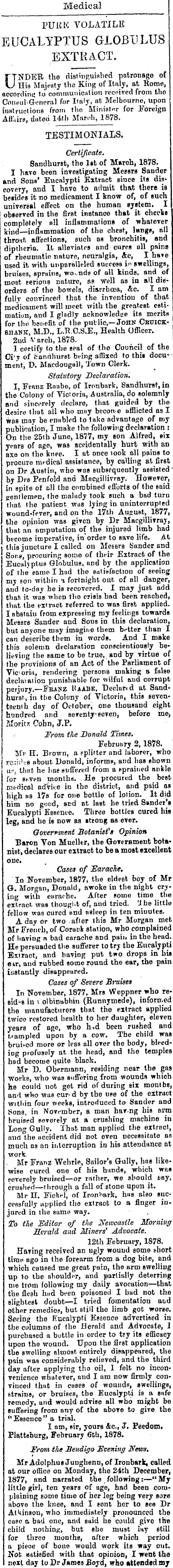 Medical PUIIK VOLATILE EUCALYPTUS GJLOBTJLUS EXTRACT. fTNDER tho distinguished pntronago of U His Majesty the King of Italy, at Rome, accordinn to communication received from the Cotieul-Generai for Italy, at Melbourne, upon instructions from the Minister for Foreign Affiiirs, dated 14th March, 1878. TESTIMONIALS. Certificate. Sandhurst, tho Ist of Maroh, 1878. I have been investigating Messrs Sander and Sons' Eucalypti Extract Bince its discovery, and I havo to admit that there i 8 betides it no medicament I know of, of such universal effect on the human system. I observed in the first instance that; it checks completely all inflammations of whatever kind—inflammation of the chest, lungs, oil throat affections, such as bronchitis, and diptheria. It alleviates and cures oil pains of rheumatic nature, neuralgia, &c, I ba»e used it with unparalleled success in swellings, bruises, sprains, wends of all kinds, and of most serious nature, as well as in ail disorders of the bowels, diarrhoea, &c. lam fully convinced that the invention of that medicament will meet with the greatest estimation, and I gladly acknowledge its merits for the benefit of the public,— John Cbtjicicshank, M.D., L/R.C.S.E., Health Officer. 2nd V arch, 1878. I certify to the seal of the Council of the Oi'y of fcancihurst being affixed to this docu--ment, D. Macdougal), Town Clerk. Statutory Declaration. I, Frnnz Rnabe, of Ironbark, Sandhurst, in the Colony of Victoria, Australia, do solemnly and sincerely declare, that guided! by the desire that all who may becon<e afflicted as I was may be enabled to take advantage of my publication, I make the following declaration : On the 25th June, 1877, my son Alfred, six years of ago, was accidentally hurt with an axe on the knee. lat once look oil pains to procure nudical assistance, by calling at first on Dr Austin, who was subsequently assisted" by Drs Penfold and Macgillivray. However, in spite of all the combined efforts of the said gentlemPD, the malady took such a bad turn that the patieDt was lying in uninterrupted wound-fever, and on the 17th August, 1877, the opinion was given by Dr Macgillivray, that an amputation of the injured limb had become imperative, in*order to save life. At this juncture I called on Messrs Sander and ! Sore, procuring some of their Extract of tho Eucalyptus Globulus, and by the application of the came I had the sat infection of seeing my son within <i fortnight out of all danger, and to-day he iB recovered. I may just add thafe it was when tho crisis bad been reached, that the extract referred to was first applied. I fibataiu from expressing ruy feelings towards Messrs Sander and Sons in this declaration, but anyone may imagine them better than I can describe them in words. And I make this solemn declaration conscientiously believing the same to be true, and by virtue of the provisions of an Act of the Parliament of Vic;oria, rendering persons making a false declaration punishable for wilful and corrupt . perjury.—Fbasz lUabe, Declared at Sand- i hurst, in the Colony of Victoria, this seventeem h day of October, one thousand eight hundred and serenty-seven, before me, Morit?! Cohn, J.P, From tlie Donald Times. February 2,1878. Mr H. Brown, a pplitter and laborer, who resifU-s about Donald, informs, and has shown a-, that he hae suffered from a sprained ankle for seven months. -He procured the ; best medical advice in the district, and paid as high as 17a for one bottle of lotion. It did him no good, »cd at last he tried Sander's Eucalypti Essence. Three botties cured his leg, and he is now as strong as ever. Government Botanist's Opinion Baron Yon Mueller, the Government botanißt, declares our extract to be a moat excellent one. Cases of Earache. Io November, 1877, the eldeßt boy of Mr G. Morgan, Donald, awoke in the night crying with earache. After some time the , extract, was thought of, and tried. 'Ihe little fellow waa cured and asleep in ten minutes. A day or two -after this Mr Morgan met; Mr French, of Coraek station, who complained of having n bad earache and paiu in the bead. . He persuaded the sufferer to try the Eucalypti i Extract, and having put two drops in his eir, and rubbed some round the ear, the pain iustantly disappeared. Cases of Severe Bruises In November, 1877, Mrs Weppner who resides in i olbinabbin (Runnymede), informed the manufacturers that the extract applied twice restored health to her daughter, eleven years of age, who h^d been rushed and trampled upon by a cow. Tbe child was bruited more or less all over the body, blecdiDg profusely at the head, and the temples had become quite black. Mr D. Obermann, residing near tbe gas works, who was suffering from wounds which 1 he could not get rid of during Bix months, and who was cur- d by tbe use of the extract ' within four weeks, introduced to Sander and Sons, in November, a man bar.ng his arm ! bruised severely at a crushing machine in ' Long Gully. That man applied the extract, and the accident did not even necessitate as much as an interruption in his attendance at work. . Mr Franz Wehrle, Sailor's Gully, has like--1 wise cured one of his hands, which was 1 severely bruised—or rather, we should say, 1 crushed—through a fall of etone upon it. i Mr H. Ficferl, of Iron hark, has also sue- ■ cessfully applied tho extract to a finger injured in the samo way. To the Editor of the Newcastle Morning Herald and Miners' Advocate. 12th February, 1878. \ Faring received an ugly wouud some short . time ago in the forearm from a dog bite, and ' which caused me great pain, the arm swelling up to tbe shoulder, and partially deterring me lrom following my daily avocation —that the flesh hud been poisoned I bad not the slightest doubt—l tried fomentation arid other remedioe, but still the limb got worse. ' Seeing the Eucalypti Essence advertised in L the columns of the JBerald and Advocate, I ' purchased a bottle in order to try its efficacy upon the wound. Upon the f