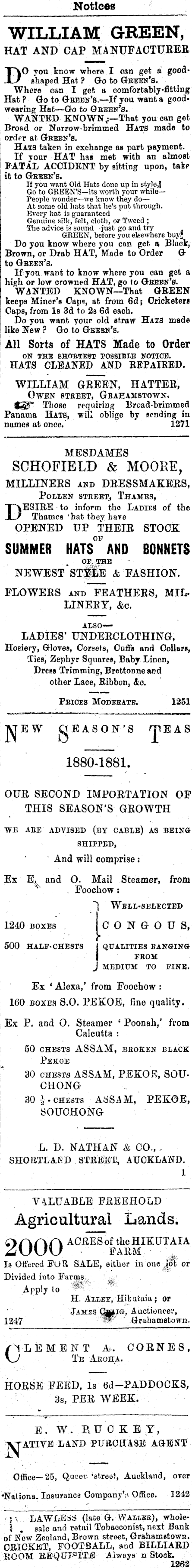 Notices WILLIAM GREEN, HAT AND CAP MANUFACTURER DO you know where I can get a goodshaped Hat ? Go to Geeen's. Where can I get a comfortably-fitting Hat ? Go to Gbeen's.—lf you want a goodwearing Hat—Go to Gbeen's. WANTED KNOWN .t—That you can get Broad or Narrow-brimmed HATS made to ordpr at Gbeen's. Hats taken in exchange as part payment. If your HAT has met with an almost FATAL ACCIDENT by sitting upon, takf it to Gbeen's. If you want Old Hats done up in sty)e,| Go to GREEN'S—its worth your whilePeople wonder—we know they do— At some old hats that he's put through. Every hat 13 guaranteed Genuine silk, felt, cloth, or Tweed ; The advice ia sound -just go and try . GREEN, before you elsewhere buy* Do you know where you can get a Black, Brown, or Drab HAT, Made to Order G to Gbeen's. If you want to know where you can get a high or low crowned HAT, go to Gbeen's. WANTED KNOWN—That GREEN keeps Miner's Caps, at from 6d; Cricketere Caps, from Is 3d to 2s 6d each. Do you want your old straw Hats made like New ? Go to Gbebn's. All Sorts of HATS Made to Order ON THE SHORTEST POSSIBIE NOTICE. HATS CLEANED AND REPAIRED. WILLIAM GREEN, HATTEE, Owen stbeet, Gbaeamstown. <3P* Those requiring Broad-brimmed Panama Hats, will oblige by sending in names at once. 1271 MESDAMES SCHOFIELD & MOORE, MILLINERS and DRESSMAKERS, POLIEN STEEET, THAMES, DESIRE to inform the Ladies of the Thames 'hat they bare OPENED UP THEIR STOCK OF SUMMER HATS AND BONNETS OE. THE NEWEST*STYI.E & FASHION. FLOWERS and FEATHERS, MILLINERY, &c. ALSO— LADIES' UNDERCLOTHING, Hosiery, Gloves, Coraefs, Cuffs and Collars, Ties, Zephyr Squares, Baby Linen, Dress Trimming, Brettonne and other Lace, Bibbon, &c. PEIOEB MODBEATE. 1251 IVTEW REASON'S mEAS 1880-1881. OUR SECOND IMPORTATION OF THIS SEASON'S GROWTH WE ABE ADVISED (BY CABLE) AS BEING SHIPPED, ' And will comprise: Ex E, x and O. Mail Steamer, from *' . Foochow : "1 Wbil-selected 1240 boxes I C O N G O U S, 500 HALF-CHESTS j QUALITIES RANGING j FROM J MEDIUM TO FINB. Ex ' Alexa,' from Foochow : 160 boxes S.O. PEKOE, fine quality. Ex P, and O. Steamer • Poonah,' from Calcutta : 50 chests ASSAM, broken black Pekoe 30 chests ASSAM, PEKOE, SOUCHONG 30 |.chests ASSAM, PEKOE, SOUCHONG L. D. NATHAN & C 0.,, SHOETLA.KD BTREEH, AUCKLAND. 1 VALUABLE FREEHOLD Agricultural Lands. G)r\f\f\ ACRES of the HIKUTAIA ZVJVJKj •■■ FARM Is Offered FOR SALE, either in one Jot or Divided into Farms Appiy to - H. Alley, Hi kufcaia; or Jamhs QafiG, Auctioneer, 1247 Grabamstown. pLEMENT A*. CORNES, \J Te Aeoha. HORSE FEED, Is 6d-PADDOCKS, 3s, PER WEEK. E. W. BU C X BY;, NATIVE LAND PURCHASE AaENT Office— 25, Queer, 'street, Auckland, over •Naliona. Insurance Company'.-^ Office. 1242 • j-. LAWLESS (kfceO-.VVALi.BB), wholeI . sale and retail Tobacconist, next Bank of Now Zealand, Brown street, Grahamstown. CRICKET, FOOTBALL, and BILLIARD ROOM BKQUJSIT,® Always n Stock. ■ ;■- ' ' ' ;. 1262 1