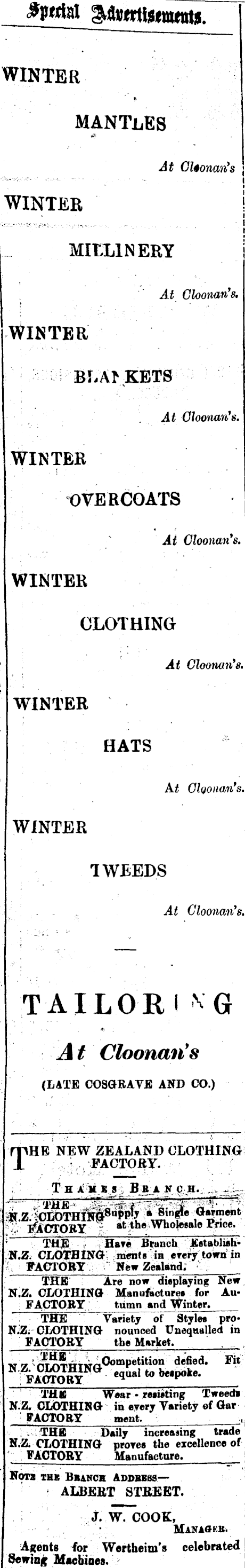 WINTER MANTLES At CUonan's ■■•■'■'•■■*■■*- ■■ •■■■•- ■ ■■■ - .. .. j WINTER | ,:..- *.■»;■*■ .. ....... ■ -I -.■■■■-■•••• • ■■■■ ■ ■ J MITLINERY I At Gloonan's. Winter At Oloonan's. WINTER OVERCOATS At Gloonan's. WINTER CLOTHING At Gloonan's. WINTER HATS At Glgonan's. WINTER TWEEDS ;•' , . .. At Gloonan's. TAILOR!VG At Cloonan's (LATE COSGRAVB AND CO.) THE NEW ZEALAND CLOTHING FACTORY. Thames Bb a kh. .- i w 7, aPP»y • Single Garment , FACTOBY - at the Whotesale Price. : ! Hare Branch EstablishN.Z. CLOTHING merits in every town in FACTORY New Zealand. THE Are now displaying New N.Z. CLOTHING Manufactures for AuFACTORY tnmn and Winter. THE Variety of Styles proN.Z. CLOTHING nounced Unequalled in FACTORY the Market. NZFA COTORY N(* to bespoke. THK Wear • resisting Tweeds N.Z. CLOTHING in eyery Variety of Gar FACTORY ment. :1 ~ THE Daily increasing trade N.Z. CLOTHING proves the excellence of FACTORY Manufacture. NOTS THE BBANCH ADOBBSS— ALBERT STREET. J. wTcOOK, Makaokb. Agents for Wertheim's celebrated Sewing Maebioes.