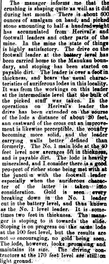 The manager inform! me that the crushing is shaping quite as well as it did during last month. There is about 600 ounces of amalgam on. band, and picked stone amounting to half a handredwjHght has accumulated from Herival'r and footwall leaders and other parts of the mine, la the mine the state of thing! is highly satisfactory. The drive on the footwall leader at the battery ApwL jbas been carried borne to the Manukaa boundary, and stoping has been started on payable dirt. The leader is over a foot in thickness, and' bears the atuiil characteristics of auriferous lodes in this locality. It was from the workings on this leader at the intermediate level that the Iralk of the picked stuff* was. taken. In the operations on Herival's leader the drire bas been extended on 'th^eourse of the lode a distance of about^'2© feet, ann eastward of the cross, cat an : improvement is likewise perceptible, the "eouifry becoming more solid, .and .the' leader carrying walls better' defined ' than formerly. The No. 1 main l«Je at the;^o feet level now. averages sft in thieknJßfW, and 19 payable dirt. The lode is heairflT mineralsed, and I consider there <isa good. prospect of richer stone being met vritlt at the junctim with the footwall leader especially when the auriferous chatao ter of the latter is taken iflto consideration. Gold is teen erety breaking down in the No. 1 leader cut in the battery level, and thas known as the No. 1 level leader; It ia.sometimes two feet in thickness. The m«na» ger is stoping to it towards the slide. Stoping is on progress on vthe saloke lode at the LOO feet level, but the results are not so encouraging, no gotd~being seen. The .lode, however, looks,:;prqna|singr and maintains its size. Hie driving* -contractors at the 170 feet level arif stHl^on light ground.