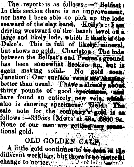 The: = report is as follows:—" Belfa«jt: la this section there is no iinproroment, nor bare I been able to pick up the lode l seaward of tbe clay band, Kelly*: J*m driring westward on the beach level oft, a large and likely lode, which X Uurtk tl the Duke's. This is full of lik«4y; mineral, but shows no gold._ Charlstont; Thejode between the Belfast's and Pevtecni ground has been somewhat brok«a no, bat it again making solicU- No gold seen. Junction :Onr ■ surface veiniTiiNfJftkftfigg better than usual." ThAwm aiewij iiMat thirty pounds of good BpwM«MW, *«M hare found an entirely; new rein, w|A)|i alao is showing speciflieqr/ :<ftfy: Ufa* sale note for the'eonip^n^Vgold is m follows :—339ott f3dwts at S&TifteO 9 8 . None of our -•—mr-irrrttmranj 'am - tionalgold, - "^ , T ;^ OLD GOLDEN Va&R ..i- ftttl* Rotd continue* to W^ettii tie diflerent but there i*fco r»iteriil change to notice*- :": '■> •o> f«" rTW-i"»