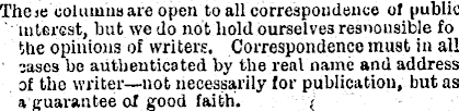 These columns are open to all correspondence of public '"interest, but we do not hold ourselves resnousibje fo the opinions of writers. Correspondence must in all ■ sases bo authenticated by the real name and address of the writer—not necessarily for publication, but as a guarantee of good faith. (