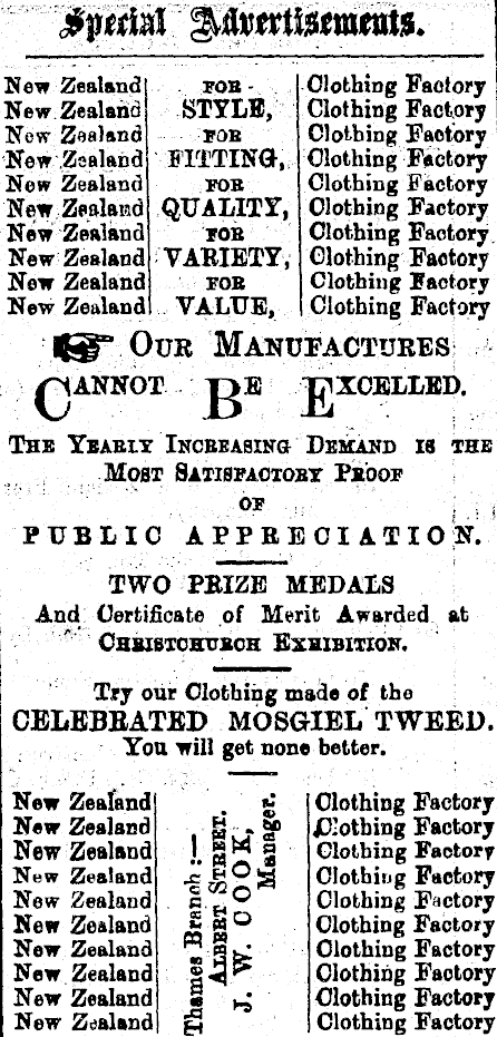 £pttix& %&vtvt\stmmts. New Zealand fob - Clothing Factory New Zealand STYLE, Clothing Factory New Zealand FOB Clothing Factory New Zealand BITTING, Clothing Factory New Zealand fob Clothing Factory New Zealand QUALITY, Clothing Factory New Zealand job Clothing Factory New Zealand VARIETY, Clothing Factory New Zealand fob Clothing factory New Zealand VALUE, Clothing Factory GiT Our Manufactures ptANNOT T>B T^XCELLED. The Ybabix iNCBBAsiNa Demand is the Most Satisfaoxobt Fxoof PUBLIC APPRECIATION. TWO PEIZE MEDALS And Certificate of Merit Awarded at Chbibtckubch Exhibition. Try our Clothing made of the CELEBBATED MOSGIEL TWEED. You will get none better. New Zealand g Clothing Factory N«w Zealand g .« jEotbing Factory New Zealand I. gM § Clothing Faetorr New Zealand jz*O% Clothing Factory New Zealand c.^ 0 Clothing Factory New Zealand £g° Clothing Factory New Zealand ™g *^ Clothing Factory New Zealand g<^ Clothing Factory New Zealand « Clothing Factory New Zealand [£j Clothing Factory