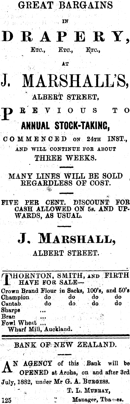 GREAT BARGAINS IN DRAPERY, Etc., Etc., Etc., AT J. MARSHALL'S, " ALBERT STREET, "DBBVIOUS TO ANNUAL STOCK-TAKING, COMMENCED ON 24th INST., AND WILL CONTINUE FOE ABOUT THREE WEEKS. MANY LINES WILL BE SOLD , REGARDLESS OF COST. FIVE PER CENT. DISCOUNT FOB CASH ALLOWED ON sa. AND UPWARDS, A 8 USUAL. J, Marsh all, ALBEET STREET. npHORNTON, SMITH, and FIRTH 11 HAVE FOR SALE— Crown Brand Flour in Sacks, 100's, and 50's Champion do do do do Cantab do do do do Sharps Bran ... - . -' Fowl Wheat ... Wharf Mill, Auckland. " BANK OF NEW ZEALAND. A N AGENCY of this . Bank will be ■L*' OPENED at Aroha, on and after 3rd July, 1882, under Mr Or. A. BtfBGESS. T. L. Motbat, 125 - Manager, Tba >ci.