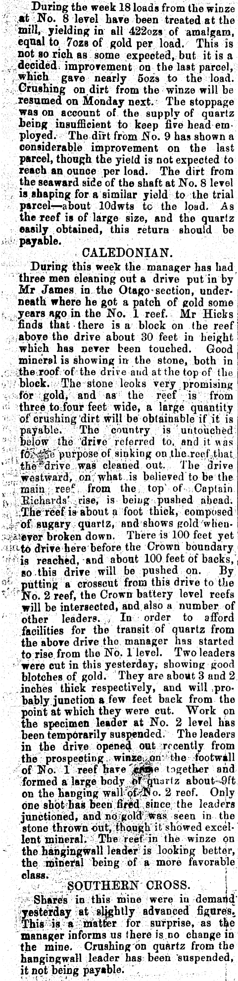During the week 18 loads from the winze '.; ,at No. 8 level have been treated at the mill, yielding in all 4220zs of amalgam, equal to 7ozb of gold per load. This is I not so rich as some expected, bat it is a . decided, improvement on the last parcel, , which_ gave nearly sozs to the load. . Crushing on dirt from the winze will be resumed on Monday next.' The stoppage was on account of the supply of quartz being insufficient to keep five head employed. The dirt from No. 9 has shown a considerable improvement on the last parcel, though the yield is not expected to reach an ounce per load. The dirt from the seaward side of the shaft at No. 8 level , is shaping for a similar yield to the trial j parcel—about lOdwts tc the load. As the reef is of large size, and the quartz easily obtained, this return should be ■ payable. . CALEDONIAN. During this week the manager has had ' three men cleaning out a drive put in by Mr James in the Otago section, underneath where he got a patch of gold some . years ago in the No. 1 reef. Mr Hicks ' finds that there is a block on the reef above the drire about 30 feet in height which has never been touched. Good mineral is showing in- the stone, both in /, .the.roof of the drive and at the top of the '. block. The stone leoks very promising : for gold, and as the reef is from three toibur feet wide, a large quantity 1 of crushing dirt will be obtainable if it is payable. The country is ' untouched ' below the "drife referred to. and it was „'.. f&NfnTe purpose of sinking on .the.reef.tuat. *'!,:the^drive was cleaned out. The drive ',; r : .westward, on, what is believed to be the reef, from the top 1 of- Captain {v Eichards' .rise, is being pushed ahead. '.Thereef is about a foot thick, composed ■ Jj."of- sugary, quartz, and shows gold 'when-.'•j-iieyer broken down. There is 100 feet yet 'Ht-to drive here before the Crown boundary ■!"is reached, and about 100 feet of backs, ' so.this drive will be pushed on. By '■'. putting a crosscut from this drive to the T- 'No. 2 reef, the Crowu battery level reefs will be intersected, and also a number of other leaders. , In order to afford facilities for the transit of quartz from the above drive tho manager has started to rise.from the No. 1 level. Two leaders ' were cut in this yesterday, showing good blotches of gold. They are about 3 and 2 , .inches thick respectively, and will ,pro- ' bably junction a few feet back from the point at which they were cut. Work on the specimen leader at No. 2 level has been temporarily suspended. The leaders in the drive opened out recently from the prospecting winzeyjir the tootwill of No. 1 reef hare *0J$ P together and formed a large body jt»t;'guar(z about--~9ft on the hanging wall-qfa®o. 2 reof. Only one shot has been fired since the leaders junctioned, and no;gol3vwas, seen in the stone thrown out, though' it showed excellent mineral. The reef "in the winze on -' the hangingwall leader is looking better, the ininefal being of a more favorable class. '," ■ ■ j SOUTHERN CBOSS. ; . ■ Shares in this mine were in demand' yesterday at sljghtly advanced figures! This is a matter for surprise, as the manager informs us there is no change in the mine. Crushing on quartz from the hangingwall leader has been 'suspended, it not being payable. '. .