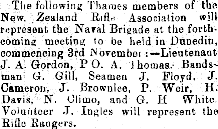 The following Tharaes members of the New. Zealand Rifld Association will; represent the Naval Brigade at the forthcoming meeting to be held in Dunedin, commencing 3rd fNbvember :— Lieutenant J. A. Gordon, PO. A. Ihomasv Bandsman G. Gill, Seamen J. Floyd. J. Cameron, J. Brownlee, P. "Weir, H. Davis, N. Olimo, and G. H White. Volunteer J, - Ingles will represent the Rifle Rangers.