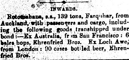 ■ a^ & —♦= -■ ikwabdb. . Botolfrfmo*, ••••, 139 tons, Farq<ihar, from Auctlurd, with pM—tx^ra and cargo, including (be following goods transhipped under bond:—Ei Außtralia, fr tm Sun Francisco : 6 bftlrs bops, Khrenfried Bros. Ex Loch Awe,' from London : 90 cases botUd beer, Khrenfried Bros. I