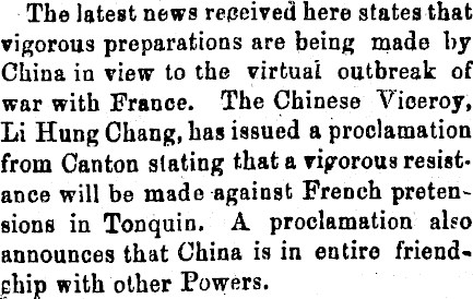 The latest news received here states that vigorous preparations are being made by China in view to the virtual outbreak of war with France. The Chinese Viceroy, Li Hung Chang, has issued a proclamation from Canton stating that a vigorous resistance will be made against French pretensions in Tonquin. A proclamation also announces that China is in entire friendship with other Powers.