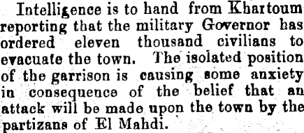 Intelligence is to hand from Khaitoum reporting that the military Governor has ordered eleven thousand civilians to evacuate the town. The isolated position of the garrison is causing some anxiety in consequence of the belief that an attack will be made upon the town by the partizans of El Mahdi.