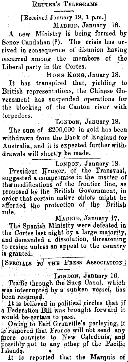 Beuteb's Telegbams [Received January 19, 1 p.m.] ■ '"-..': Mapbid, January 18. A new Ministry is being fprraed by Senor Candahan (P). The crisis has arrived in consequence of disunion having occurred among the members of the Liberal party in the Cortes. ; U ONa Kong, Jriuary 18. It has transpired that, yielding to British representations, the Chinese Go* j Ternment has suspended operations for the blocking of the Canton river with torpedoes. London, January 18. The sum of £200,000 in gold has been withdrawn from the Bank of England for Australia, and it is expected further withdrawals will shortly be made. London, January 18> President Jfrugej?,' oi the Transyaal, suggested a compromise in the matter of thtf modifications of the frontier line, as proposed by the British Government, in order that certain native chiefs might be afforded the protection of the British j rule. ■ ■■■•' '•■ : ' ' ■."'•■■ ■•"' Madbid, January 17. The Spanish Ministry were defeated in the Cortes last night by a large majority, and demanded a dissolution, threatening to resign unless an appeal to the country is granted. [Specials to the Pbess Association] London, January 16. Traffic through 'the Suez Caaal, which was interrupted by a sunken vessel", has been resumed. It is believed in political circles that if a Federation Bill was brought forward it would: be certain, to pass. Owing to Earl Granville's parleying, it ip rqnibreid that France will not send any jmore eonvjcts tp New Caledoniay antj possibly not to any other pf t|ie pacific Islands.' • ' • It is reported that the Marquis of