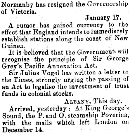 Normanby has resigned the Governorship of Victoria. January 17. A rumor has gained currency to the effect that England intends to immediately j establish stations along the coast of New Guinea. It is believed that the Government-will recognise the principle of Sir George Grey's Pacific Annexation Act. Sir Julius Vognl has written a letter to the Times, strongly urging the passing of an Act to legalise the investment of trust funds iv colonial stocks. Albany, This day. Arrived, yesterday : At King George's Sound, the P. and O. steamship Poverina, with the mails which left London on December 14.