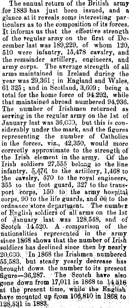 The annual return of the British army for 1883 has just been issued, and a glance at it reveals some interesting particulars as to the composition of its forces. It informs us that the effective strength of the regular army on the first of December last was 189,229, of whom 120, 510 were infantry, 15,478 cavalry, and the remainder artillery, engineers, and army corps. The average strength of all arms maintained in Ireland during the year was 29,361; in England and Wales, 61 325,; and in S'cotlaud, 3,609 ; being a total for the home force of 94,29,2, while that maintained abroad numbered 94,936. The number of Irishmen returned as serving in the regular army on the Ist of January last was 36,003, but this is considerably under the mark, and the figures representing the number of Catholics in the forces, viz., 42,350, would more correctly approximate to the strength of the Irish element in the array, (if the Irish soldiers 27,555 belong to the line infantry, 5,47,6, to the artillery, 1,468 to the cavalry, 570 to the royal engineers, 355 to the foot guard, 327 to the transport ijorps, 150 to; the army hospit^. corps, 90 to the life guards, and 36j to the ordnance'store department. Toe number of E.nglisq soldiers of all arms on the Ist of January ,last:<was 128,548, and of Septch 14.520. A ■• comparison, of the nationalities represented in the army since I§6B shows that the number of Irish soldiers has declined since then by nearly 20,000., 1868 the Irishmen numbered 55;583, but steady yearly decrease has brought down the number to its present figure—36,2B7. The Scotch have also gone down from 17,011 in 1868 to at the present time, w'fljle the English haye mouotpdV up f?om 10&810 in 1.86 ato 1^8,,53l in-1883. :; :'" ',; i!.:-V\ :