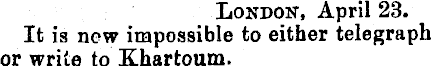 London, April 23. It is new impossible to either telegraph or write to Khartoum.