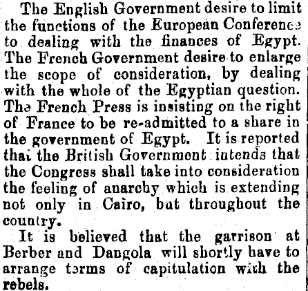 The English Government desire to limit the functions of the European Conference to dealing with the finances of Egypt. The French Government desire to enlarge the scope of consideration, by dealing with the whole of the Egyptian question. The French Press is insisting on the right of France to be re-admitted to a share in the government of Egypt. It is reported thai the British Government intends that the Congress shall take into consideration the feeling of anarchy which is extending not only in Cairo, bat throughout the country. It is believed that the garrison at Berber and Dangola will shortly have to arrange tarms of capitulation with the rebels.