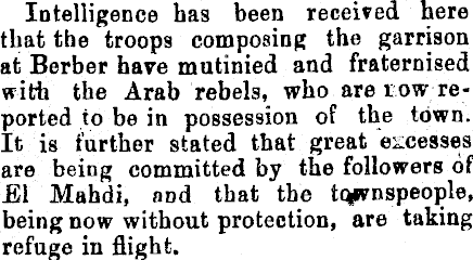 Intelligence has been received here that the troops composing the garrison at Berber have mutinied and fraternised with the Arab rebels, who are row reported to be in possession of the town. It is further stated that great excesses are being committed by the followers of El Mahdi, and that the townspeople, being now without protection, are taking refuge in flight.