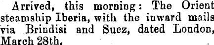 Arrived, this morning: The Orient steamship Iberia, with the inward mails via Brindisi and Suez, dated London, March 28th.