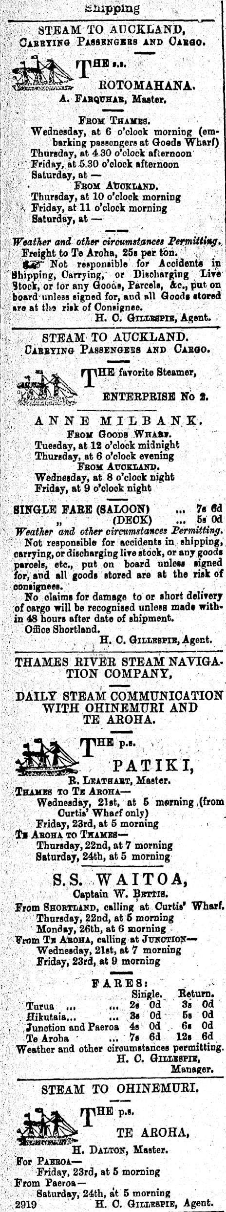 ."'/ ' ■ . 'T: STEAM TO AUCKLAND, *~ > OaBBYIKG PASfIBKGBBB AND CABOO. . a I,ZK^L mflß s.s. .&Py§£» EOTOMAHANA. /, V A. Fahquhab, Master, Fboie Thames. , Wednesday, at 6 o'clook morning (embarking passengers at Goods Wharf) :' Thursday, at 4.30 o'clock afternoon' , -■' .Friday, at-5.30 o'clock afternoon ."'■ . Saturday, at — FBOM AUCKLAND. Thursday, at 10 o'clock morning . : * \ Friday, at 11 o'clock morning Saturday, at — Weather and other circumstances Permitting.. Freight to Te Aroha, 25s per ton. ': . ftiir Not responsible for Accidents in Shipping, Carrying, or Discharging Live Stock, or ior any Gooois, Parcel*, Ac, put on board unleßß signed for, and all Goods stored ■ »ro at tli/s risk of Consignee. H. 0. Gnxrara, Agent. . .■ ■' STEAM TO AUCKLAND. " Cabbyjng Passengetjs and Caboo. "X A, fTiHlr favorite Steamer, '' 2illlJ§s* ENTERPRISE No 2. AN NE MILB A N K. Fboh Goodb Wha*». , Tuesday, at 12 o'clock midnight i Thursday, at 6 o'clock evening ' Fbok Auckland. Wednesday, at 8 o'clook night Friday, at 9 o'clook night . SINGLE FABE (SALOON) ... 7s 6d (DECK) ... 5s Od ' Weather and other circumstances Permitting,. Not responsible for accidents in shipping, carrying, or discharging live stock, or any goods parcels, etc., put on board unless signed for, and all goods stored are at the risk of . -consignees. No claims for damage to or short delivery of cargo will be recognised unless mad* within 48 hours after date of shipment. . Offioe Shortland. . , H. 0. Giiabbpib, Agent. THAMES EIVEE STEAM NAVIGATION COMPANY, DAILY STEAM COMMUNICATION WITH OHINEMUEI AND TE AEOHA. -"ift rpHE p.s. MHbi>^» PATTTCT R. Lbathabt, Master. Teakbs to Tk Aboha— Wednesday, 21st, at 5 m«rning ,(from Curtis' Wharf only) Friday, 23rd, at 5 morning > Ti Aboha to Thames— Thursday, 22nd, at 7 morning Saturday, 24th, at 5 morning S.S. WAITOA, Captain W. BbtMS. From ShobtiiAKD, calling at Curtis' Wharf. Thursday, 22nd, at 5 morning Monday, 26th, at 6 morning - From Ta Aboha, calling at JtmoTiojir— Wednesday, 2lst, at 7 morning Friday, 23rd, at 9 morning FA*RES: Single. Return. Turua , ... 2s Od 3s Od . flikutaia 8s Od 5s Od , Junction and Paeroa 4s Od . 6s Od Te Aroha ... 7s 6d 12s 6d ' Weather and other circumstances permitting. '. H. C. GmaßPiH, I Manager. STEAM TO OHINEMUEI. i "I "^vJ^. fTiHE'p.B. j^^j^^i TE AEOHA, H. Dai>tok, Master. For Pabboa— Friday, 23rd, at 5 morning From Paeroa— 1 ' Saturday, 24th, at 5 morning 2919 H. C. Giiarcsgiß, Agent.
