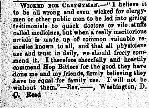 \ Wickbd job CisyaTMAH.—" I believe it to be all wrong and even wicked for clergy ' men or other public men to be led into giving testimonials to quaok dootors or vile stuffs called medicines, but when a really meritorious ,'-■ article is made up of common valuable re* ' medics known to all, and that all physicians ] ' use and trust in daily, we* should freely commend. it. I therefore cheerfully and heartily ! ' . «ommend Hop Bitters for the good they have ' •done me and my friends, firmly believing they i •. /.have rib equal for family use. I will not be ; * \ without them."—Rev. ■, Washington, D. : '■■<?, Bw4 , - |