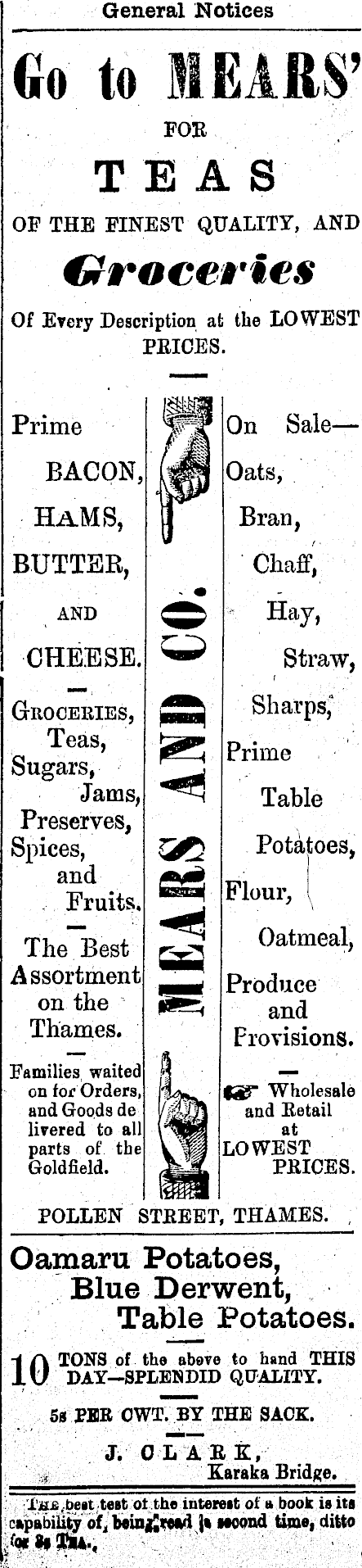General Notices Go to lEARS' FOR TEAS OF THE FINEST QUALITY, AND Groceries Of Every Description afc the LOWEST PEICES. Prime W§ On Sale— BACON, jw Oats, ' HiLMS, J Bran, BUTTER, Chaff, and Hay, CHEESE. Straw, Groceries, ££)' Sharps, .Teas, ..|25 Prime Sugars, V~J Jams, Table Preserves, Spices, Potatoes, and g^ „, Fruits. Flour, I The"Best Oatmea^ Assortment J* Produce on the p^^ and Thames. Provisions. Families waited ,1 -^- on for Orders, |%*^ IST Wholesale and Goods de i^^B and Ketail livered to all y^mi at parts of the v'l LOWEST Goldfield. %*IL PKICES. POLLEN STBEET, THAMES. , Oamaru Potatoes, Blue Derwent, Table Potatoes. i A TONS of the above to hand THIS 1U DAY—SPLEKDID QUALITY. 50 PER OWT. BY THE SACK. J. OLAEK, , Earaka Bridge. I'iijß ,beit test ol the interest of a book is its capability of t b«injC««ftd |t hoqvA tune, ditto