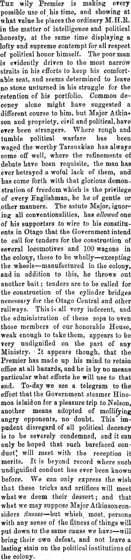 The wily Premier is making every possible use of his time, and showing at what value he places the ordinary M.H.E. in the matter of intelligence and political honesty, at the same.time displaying a lofty and supreme contempt for all respect of political honor himself. The poor man is evidently to the most narrow straits in his efforts to keep his comfortable seat, and seems determined to leave no stone unturned in his struggle for the retention of his portfolio. Common decency alone might have suggested a different course to him, but Major Atkin» son and propriety, civil and political, have ever been strangers. Where rough and tumble political warfare has been waged the worthy Taranakian has always come off well, where the refinements of debate have been requisite, the man has ever betrayed a woful lack of them, and has come forth with that glorious demonstration of freedom which is the privilege of every Englishman, be he of gentle or .other manners. The astute Major, ignor* ing all conventionalities, has allowed one of his supportsrs to wire to his constituents in Otago that the Government intend to call for tenders for. the construction of several locomotives and 100 wagons in the colony, these to be wholly—excepting the wheels—manufactured in the colony, and in addition to this, he throws out another bait: tenders are to be called for the construction of the cylinder bridges necessary for the Otago Central and other railways. This is all very indecent, and the administration of these sops to 'even those members of our honorable House, weak enough to take them, appears to be very undignified on the part of any Ministry. It appears though, that the Premier has made up his mind to retain office at all hazards, and he is by no means particular what efforts he will uee to that end. To-day we see a telegram to the effect that the Government steamer Hinemoa is laid on for a pleasure trip to Nelson, another means adopted of mollifying angry opponents, no doubt. This* impudent disregard of all political decency is to be severely condemned, and it can only be hoped that such barefaced conduct^ will meet with the reception it merits. It is beyond record where such undignified conduct has ever been known before. We can only express the wish that these tricks and artifices will meet what we deem their dessert; and that what we may suppose Major Atkinson considers finesse —but which % most, persons with any sense of the fitness °f things will put down to the same cause we hays—will bring their own defeat, and not leave a lasting stain on the political institutions of the colony.
