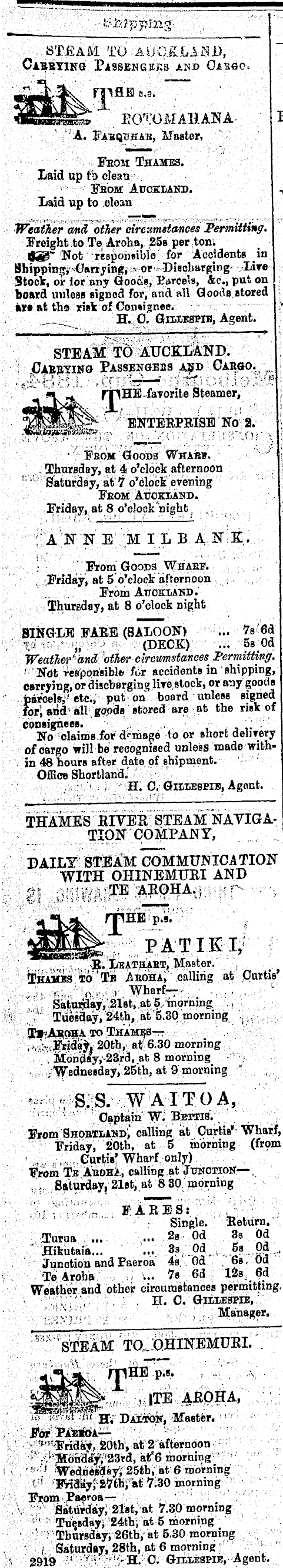 STE AM. TO A IJ O£LA MD, CaBBYING PaSSENQKES JUSD OaBGC. aßfinli^ ECA'OMAHANAA. Fabqtjeab, Master, Fbom Thames. Laid up tb clean Fbom Auckland. Laid up to clean Weather and other circumstances Permitting, j Freight to Ta Aroha, 25b per ton. I ggT Not responsible for Accidents in Shipping, Carrying, or Discharging- Life Stock, or lor any Gooole, Enrcels, Ac, put on board unless signed for, and all Goods stored kr* at tho risk of Consignee. H. C. GitiißSPlE, Agent. STEAM TO AUCKLAND. JDabbting Passengebs a^d Cabck)., « mHE-faTorite Steamer, ' ' ENTERPBISE No' 2. • Fbom Goods Whab*. - Thursday, at 4 o'clock afternoon ' Saturday, at 7 o'clock evening Feom Attokiand. Friday, at 8 o'clock'nighfc /AN N E lIIBANK. ' From Goods Whabf. . Friday, at 5 o'clock afternoon , From AttoktiAHß. Thursday, at 8 o'clock night SINGLE FARE (SALOON) ... Is 6d X- : „-■:■ (DECK) ... 5s Od Weather'and other circumstances Permitting. ' Not responsible fur accidents in shipping, carrying, or discharging lireßtock, or aTiy goods parcels,' etc., put on board unless signec for;»nd all goods stored are at the risk of consignees. , ; No claims for damage to or short delivery of cargo will be recognised unless made within 48 hours after date of shipment. Office Shortland.' . H; O« GIIEEBPIE, Agent. THAMES BIVES STEAM NAVIGA TION COMPANY, DAILY STEAM CcTmMUNICATION WITH OHINEMUEI AND ;,;,:r/.rTE ;AEOHA. ; -^ *l "Iviiv nfIHE p.s» PATIKT .... ■"■ • "B" Lbathabt, Master. TiffAKBS to'Tb Aboha,' calling at Curtis' . . ... s ,, , Wharf— - . , , " ' Saturday, 21st, at 5. morning , Tuesday, 24th,,at'5.30 morning , , TI'ABQHf to Thames— .«,."•■>. Friday, 20fch, at 6.30 morning , Mon'clay,-2Srd, at 8 morning /Wednesday, 25th, at 9 morning ' : ; S;S. WAITOA, : ' Captain W. BettiS. From Shobtland;' calling at Curtis' Wharf, Friday, 20th, at 5 morning (from ■ . , , . Curtis' Wharf only) From Ta Aboha, calling at Junction — , . Saturday, 21st, at 8 30. morning '.- ';■ "".. « FAEES: Single. Eeturn. Turua 2s Od 3s Od flikutaia 3a 0d ( . 5s Od , Junction and Paeroa 4s Od 6s, Od TeAroha - ... 7s 6d 12s 6d Weather and other circumstances permitting. ,; ■", . . n. c. giliebpie, ', _"'! 1 , . Manager. ''H'" "STEAM TOjQHmEMURI. . '- ■ A L™iV^ — <^^^... , |TE A&QHA, •;« ( -r-'A .in jj; DjjaoN, Master. ffm Pastoa— ■/■''"Friday, 20th, at 2 afternoon ' ,''Monday,'23rd, a«*6 morning ' i '' -'■ "' -Wednesday",' 25th, at 6 morning -' Fridayi 27tbi at 7.30 morning From Paeroa— Saturday, 21st, at 7.30 morning 1 Tuesday; 24th, at 5 morning 1 •' Thursday, 26th,'at 5,30 morning ' ; Saturday, 28th, at 6 morning ' 2919 l V - '■'."'H. C. GIIXESPIE, Agent.