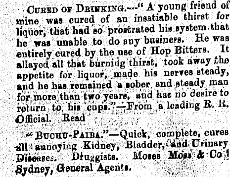 . Cuebd ob DbwkukJ.--" A young friend of mine was cured of an insatiable thirst for Kqiior, thafi hiidßO prdßfcrated bia system that he was unable to do any bußineps. He was entirely cured by the use of Hop Bitters. It allayed all that borniug thirst, took away ftne appetite for liquor, .made his nertes steady, and he has remained a sober and steady man - fo>,more,th'an Wb years, and has no desire to return to,'fiis 'capi"r~Ftoia a leading B. «. Official.,. ..Read" ; • .".'. , V , .'-..,.' . - *« Buohtt-Paiba.."—QuicV, complete, cures ■Hll:»nnoyiiig Kidney, Bladder,-''anil; Urinary Piteaßes. Diuggists. Mo«es MoM * Co)] •jSjdney, oen«ral Agenti. * :< r 'J'-. ,.