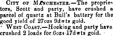Citt of M^Nchesteb.—The proprietors, Scott and party, have crushed a parcel of. quartz at Bull's battery for the good yield of 27ozs 9dwts gold. • West Coast;— Hocking and party have crushed 2 loads for 6ozs 17dwts gold.