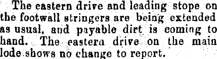 The eastern drive and leading stope on the footwall stringers are being extended as usual, and payable dirt; is coming to hand. The eastern drive on the main lode.shows no change to report.