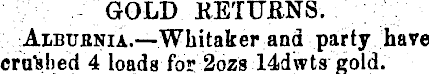 GOLD RETURNS. Aibtjbnia.—Whitaker and party have cru'sbed 4 loads for 2ozsl4dwts gold.