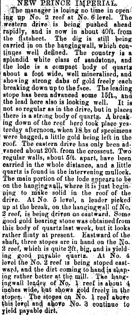 T> NEW BJiINCE - f AgPigRIAIt. iiThe n^anager is losing no time .in.opeh:'-' |flg ijp Sp. 2 reef at No(f level. The western drire is being 'pushed ahead rapidly, and is now in about 40ft. from the flatsheet. Th,e dig is attyl being carried in on the hang}ngwall, which cpn,* Navies wel| definecl. The country ia a splendid white class of sanditone, and the lode is a compact body of quarts about a foot wide, well mineralised, and showing strong dabs of gold freely teach breaking down up to the face. The leading stope has been advanced some 15ft., and the lead here also is looking well. It is not so regular as in the drive, but in places there is a strong body of quarta. 4 breaking down of the reef herp took place yesterday afternoon., when lg.bs of specimens were jbagged, a little gold being left in ihe roof. The eastern drive has only been advanced about 20ft. from the crosscut. Two regular walls, about sft. apart, have been carried in the whole distance, and a little quartz is found in the intervening mullock. The main portion of the lode appears to be on the hangingwa^l, where itis just beginning to make solid in the roof of the drive. At No. 5 level, a leader picked up at the break, on.the liangingwall afNo, 2 reef, is being driven on eastward, Some good gold bearing stone was obtained from this body of quartz last week, but it looks rather flinty at present. Eastward of the shaft, three stopes are ia hand on the £[o. 2 reef, which is quite 2ft, bjjj, and is yielding g^ood pajablc quartz. At No. 4 level the No. 2 reef is being stoped eastward, and the dirt coming to hanc^a shaping rather better at th'el ra^ll. Tke hangjngwafl lea^e^ of Np> 1- reef is about inches wide, b.ut sh,ows gold freely iq {\\o aiowK < $hiasotys or No. lyeef abofe this; lev§l anfl a^o*p Jfo. 3 eoatinue to [ yjeld payable dirfc. ;