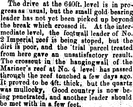 The drive at the 640 ft. level is in progress as usual, but the small gold bearing leader has not yet been picked op beyond the break which crossed it. At the intermediate level, the foqtwa^l leader of No. 2 Imperia|[ $eef ft being stpped, but the dirt iV poor, and the Hrial parcel treated from here gave an unsatisfactory result. The crossout in, ithe hangingwaH of the Mariner's reef a.t No. 4 level has passed through the reef touched a few days ago. Jt proved to be 4ft; thick,, but the qnartz was mullooky, Good country is now being penetrated, and another leader should be met with in a few feet.; , '
