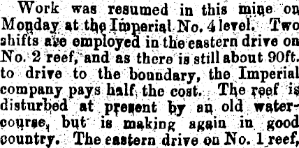 Work was resumed in this mine on Monday;^t t^e ImßerialNo, 4 leveK Two shifts aje employed in the eastern drive on Nb>2jreWand as theWiastill about 90ft. to drive to the boundary, the imperial company pays; half the cost. Th^e reef ii? disturbed at; present bbi old waters course, bqt* is making agaia in. good country^ The eastern drive on No. ljfeef.