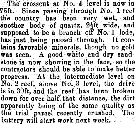 The cj;osscut at No. 4 level is now ia 75fty Since passing through No. 1 reef the country has beon very wet, and another body of quartz, 2|t't wide, and supposed to be a branch off No. 1 lode, has just being passed through. It contains favorable minerals, though no gold was seen. A Rood white and dry sandstone is now showing in the face, so the contractors should be able to make better progress. Ai the intermediate level on No. 2 reef, above No. 3 level, the drire is in 30ft, and the reef has: been broken down for over half, that distance, the dirt apparently being of the same quality as the trial parcel recently crushed. The battery will start work next week.