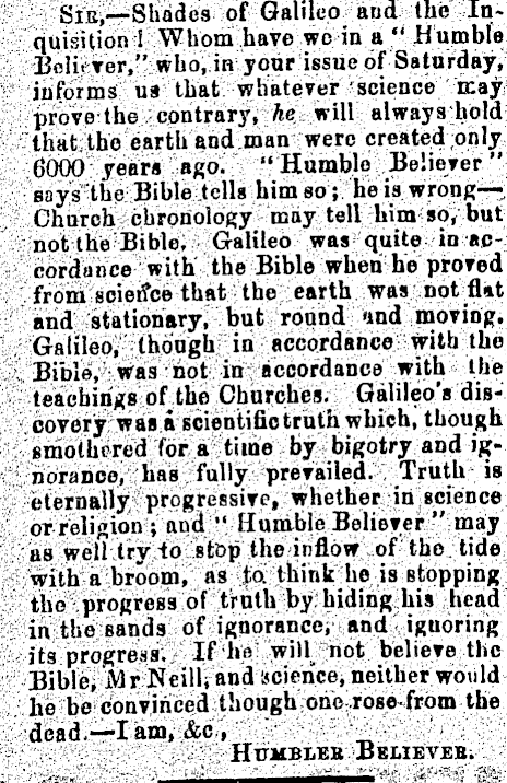 Siu,—Shades of Galileo and the In« quisition I Whom have we in a " Humble 13olit rer," who, in your issue of Saturday, informs us that whatever science Kay prove the contrary, he will always hold that the earth and roan were created only 6000 years ago. "Humble Believer" says the Bible tells him so; he is wrong—. Church chronology nany tell him so, but not the Bible, Galileo was quite in accordance with the Bible when he proved from scietfee that the earth was not flit and stationary, but round und moving. Galileo, though in accordance with the , Bible, was not in accordance with ihe teachings of the Churches. Galileo's discovery was a scientific truth which, though smothered for a time by bigotry and ignorance, has fully prevailed. Truth is 'eternally progressive, whether in science ot religion ; and " Humble Believer " may us well try io stop the inflow of the tide with a broom, as to. think he is Btopping the progress of truth by hiding his head in the Bands of ignorance, and < ignoring its progress. If ha will not believe the Bible, Mr Neill, and science, neither would he be convinced though one rose-from the dead.—lam, &c, Humbles Believes.