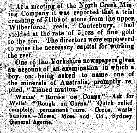 ,-H At 1 a meetinjjt of tbe NorJEh CreckJMin- ' me Company it was reported that a trial crushing of Wlbsdt stone-from the upper Wilberforcd" reefs, Canterbury, had yielded at the rate of 5-}ozs of JBne gold to the ton. The directors were empowerd .-to raiae the necessary «apital fortrttkibg the reef. , . . , , ,,O ne of the Yorkshire new»p»p«iigiwi • an acoonnt of' in examination in irhich • boy on being asked to name one of the minerals of Australia, .promptly re < -. plied, " Tinned mutton." -I** *' ■' " Wmu' "Botch oh. Oowfs."—Atk for Well.' «Bouek on Oorm." Quick relief complete, permanent' cure. Oorni, warta bunioni.—MoHt, Mot* and do, 'Sydney Qeneml Ajpnt*.