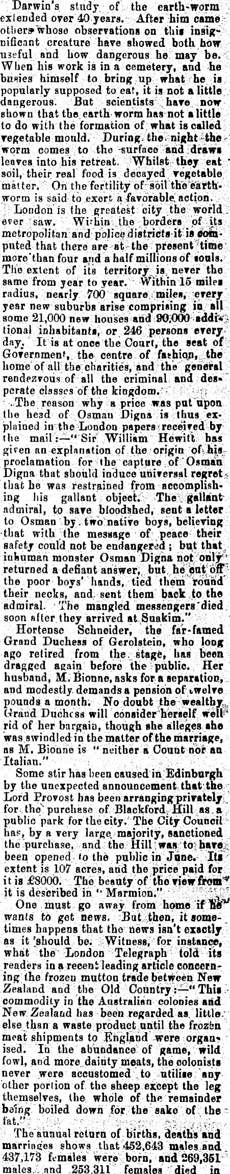 Darwin's study, of the earth-worni extended over 40 years. After him came - other*whose observations on this insignificant creature haye showed both fabw useful and how dangerous he'may be. ? When his work is in a cemetery, and -he busies himself to bring up; whati'he is popularly supposed to eat, it is not a iitilo dangerous. But scientists:;; have now; shown that the. earth'worm has not a little to do with the formation of what is called: : vegetablemould. Durinj?=thefenij{ht|the>' worm comes ;to the andi^raws leaves into his retreat; ?WhilstitKey eat * soil, their real food is decayed V vegetable:; matter; ■ On the fertilitybf^sbiUthlJ^rth* worm is said to exert ajfavorable; action.;;>'-.. j London 'is the greatest city {the; world ever .'{.saw.- bordjers^f metrbpolitan;and pojic^istribtfl-itai Jc^iputed that there are atvthe ; presentltirai- ' more'than four and a half millions of lonis. The extent of itsi territory^js never I;he same from year to year. Wthinls miles radius, nearly 700 squarer<mUesv ;erejry ■ year new suburbs arise comprising jo ■ »U some 21,000 new houses and tional inhabitants^ or 246 persons ererjr*: day. It is at once the.Court, the seat :pt^ Government, the centre of fashiojijijthe home of alUtbe charities, and?the geneirals rendezvous of all the criminal and des« ? perate classes of the kingdoni.r^ t.i;;':'^f; 5! r ■ .The reason why a price was putupon the head of: Osmau Digna is ithus ex^, plained in theioodon papers?recesVed by the mail:—''■Sir William Hewitt.' has giren an explanation of the ■origin of;Jusproclamation for the capture :of;" Osman Digna that should induce universaJL regret* that he was restrained from accomplish* ing his gallant objects Thel ialla"nt..■• admiral, to save bloodshed, sent a letter to Osman by; twb:native boys, believing ; that with the message of peace their safety could not be endangered ; but that a inhuman monster Osman Digna not onl^y returned a defiant ans^eriibut^he^n^j^! the poor boys' hands,, tied themground' their necks, and, sent them back to the admiral. The mangled messengers'died soon after they arrived at.Suakimi.'v Hortense Schneider, the far-famed Grand Duchess of Gerolstein, who long ago retired from the/ stage, has tfeen : dragged again beJFore the Her j husband, M. Bionne, asks for a separttion, and modestly, demands a pension of twelve pounds a month: No doubt -the: wealthy Grand Duchess will consider hergelf weH£' rid of her bargain, though she alleges she was swindled in the matter of the marriage, as M. Bionhe is " neithM a Count nor aa Italian." ; ;-;;-.:. ':.',. -.S ■■'■■■* ■^■^'"■:*''-:' ■■'■ -■ ■ Some stir has been caused in Edinburgh by the unexpected announcement that the Lord Provost has been arranging privately for.thq xpurchase of, Blackfprd. r Hill^as,aj' public park for thexity.: The City\Oouncil> ha?, by a very large majority, sanctioned the and the Hilliwas'td|haTiy| been opened >o the public in J^i?ne. Iti^ I extent is 107 acres, and the price paid for;: it is £8000. The beauty of' tßoVjewfroin^; ■ it 'is described' rin;'': : Marmion."-; ■>^.?^ {-M! i One must go away from homis if TSo*' ! wants to get news. But^ithenr it sometimes happens that the news isn't exactly as it [should be^SWitnessV for instance, what the Telegraph fold; its readers in a recent leading article concerning the frozeu mutton trade between Neir Zealand > and the Old Country^" Thii ■ • commodity in the Aastralisn colonies and New. Zealand has been regarded as. littl».; else than a waste product until the frozfen ' meat shipments to Rhgland were organ* ised. In the abundance of game, wild fowl, and more dainty meats, the colonists never were accustomed to utilise.; any other portion of the sheep except the leg themselves, the whole of the remainder being boiled dowii for the sake of the ~ fat.'?;v :;vi% Theaunualreturn of births, deaths and marrinqeß shows that 452,643 males and _ 437,1^3 females were born/ and 269,351^ males. L and 253 311^ females died in