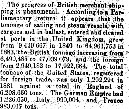■■': The progress of Britieh merchant ahip-. piDg is phenomenal. ' Ac^oraiiig tt^^jj* liamentary -return it ? appears *thajt^bo tonoage of sailing and steam tesselii with cargoes and in ballast, entered and cleared at ports in^th^United Kingdom, grow; from 9,439;667?in 1840 tb-64;9^i;753 iii ' 1883, the -British tonnage increasing^|^<itnr'* 6,490,485 to 47,039 079j and-;the foreign s from 2,949,182 to 17i922,664.; The^tptalT, toniiage of the United StitesV registered ? for foreign trade^was only 1,292,294 in 1881 against a total in England of 6.208.650 tons. The German Empire had 1,226,650, Italy -990,004, and-i'rancß 983,017 tons. "" : >■ ■■••■■- <-t^:^-:. ■■■..-■;