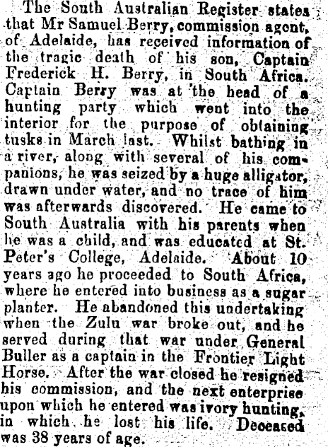 ; The South Australian; Eegister^ states:| ■that Mr Samuel Berry, commission agent, oft Adelaide, has received mfprmatijon of-„ the jtragic death of" his ion, l^ptaiia^ Frederick H. Berry,' in > South"; A.frickis3 Captain Berry -iras.Vat*thehead":£f:j»'^-' hunting ..partyi-wbiicb '(,',neht ■ "mto!^ltlie^l ■ | interior ; for the purpose .'."'obtaining:' tusks in March J ast. ■ Whilst bathing in - -a; river,- along with seretalFof his: com* i pant6nsrheiya9 seized=|t»y a huge alligator, --■* drawn/under water/ and :^b trace Sdftiim^S was afterwards discbrereid. v Ife camrt^l South Australia with his parent^ when ; liie was a child, and; was educated Sat i'Sti ''^' ; Peter's College, A^ years ago he proceeded to South Africa, where he entered into business 4r» sagari;planter. He abandoned this undertaking;- ; when the Zulu war broke outj-and he served during that war undei, (Je^eral Buller as a captain in the I'rdntieic !liight Horse.-'After thei war clo¥ed he his commission, and the next enterprise upon which he entered wasirory hunting,; in which, he lost hisiifel^EledeaEod was 38 years 'of age;'::--;^:^-: K':-Xy'-::y^ACa ;>'-.'■ "-: