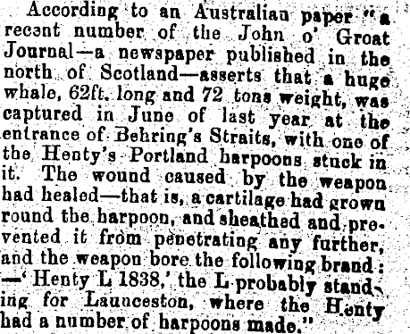 According to an Australian paper *'a - recant number of the John o* Groat Journal—a newspaper published in the north of Scotland—asserts that "a hue©" whale, 62ft. long and 72 tons weight, was captured in June of last year at the ' entrance of Bearing's Straits, with one of ' the Henty's Portland harpoons stuck in u'j ? * f ound caused b * the weapon had healed—that is, a cartilage had grown round the harpoon, and sheathed and prevented it frdm penetrating any further and the weapon bore the following brand • -' Henty L 1838/ the L probably stands ing for Launceston, where the F^ntr had a number of harpoons made." *