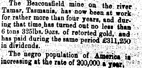 The Beaconsfield mine on the rirer Tamar, Tasmania, has now been at work ' for rather more than four years, and dor. ing that time.has tamed oat no leu than ' ■ 6 tons 3251b5. 9ozs. of retorted gold, and " has paid during the same period £311,250 mdindends. .' \ , / . The negro population of. America it" »nore»(ing at the rate of 300,000 a yttr, "; •