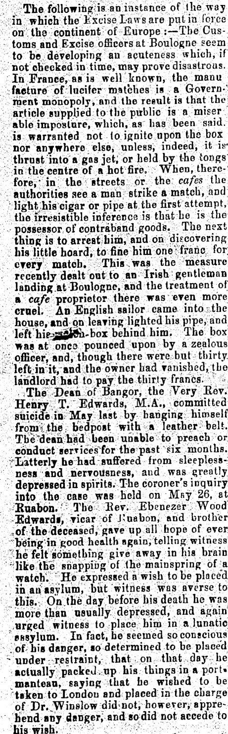 The followitg is an instance of the way in which the Kxciso Laws are put in Force on the continent of Europe :—Tbe Customs and Excise officers at Boulogne seem to be developing an acuteness which, if not checked in time, may prove disastrous. ' In France, ag is well known, the manu faetnre of lncifer matches is a Govern-* rnent monopoly, and the result is that the article supplied to the public is a miser able imposture, which, as has been said. is warranted not to ignite upon the box nor anywhere else, unless, indeed, it ir thrust into a gas jet, or held by the tongs in the centre of a hot fire. When, therefore,' in the streets or the cafes the authorities see a man strike a match, and light his cigar or pipe at the first attempt, the irresistible inference is that he is the possessor of contraband goods. The next thing is to arrest him, and on discovering his little hoard, to fine him one' franc for every match. This was tbe measure recently dealt out to an Irish gentleman landing at Boulogne, and the treatment of a cafe proprietor there was even more cruel. An English sailor came into the house, and Qn leaving lighted his pipe, and , left hie3s2fc&-DOX behind him. The box was at onC3 pounced upon by a zealous " officer, and, though there were but thirty .. left in it, and the owner had vanished, tho landlord had to pay the thirty francs. The Dean of Bangor, the Very Eev. Henry T. Edwards, M.A., committed suicide in May last by banging himself from? the bedpost with a leather belt. Tbe dean had been unable to preach or conduct services for the past six months. 'Latterly he had suffered from sleeplessness and nervousness, aud was greatly depressed in spirits. The coroner's inquiry into the case was held on Mfiy 26, at Bnabon. The' Eev. Ebenezer Wood Edwardl, vicar of J^uabon, and brother of thedeceased, gave up all hope of ever bdngin good health again, telling witness ' he felt something give away in his brain ' like the snapping of the mainspring of a watch'. He expressed a wish to be placed in an asylum, but witness was averse to this. On the day before his death he was more than usually depressed, and again urged witness to place him in a lunatic gßsylum. In fact, he seemed so conscious of his danger, so determined to be placed - under restraint, that on that day he actually packed.up his things in a port* manteau, saying that be wished to be taken to London and placed in the charge of Dr.JVinslow did-not, however, apprehend any danger, and so did not accede to his wish.